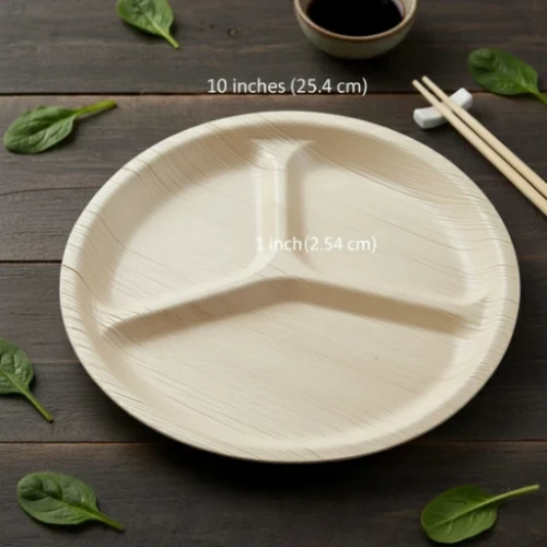 10 Inch Round 3-Compartment Areca Palm Leaf Plate – Export-Grade Bio-Disposable