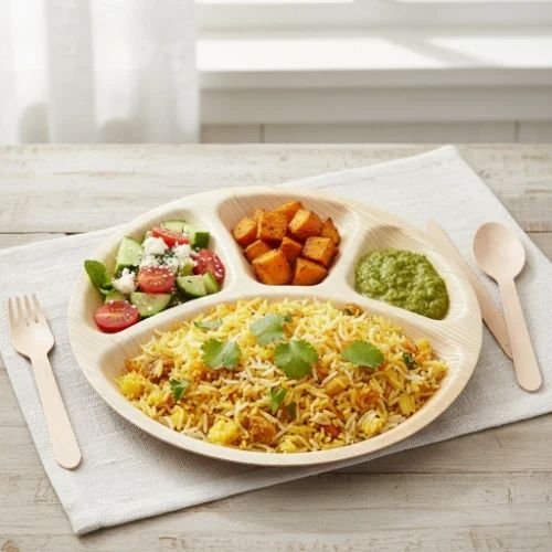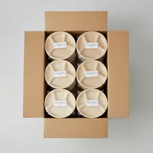 The plate is formed from areca sheath and heat-pressed at 180°C to set the fiber structure and maintain divider definition under load. Heat pressing creates a semi-hydrophobic surface and consistent rib geometry across compartments, supporting industrial-grade durability with wall thickness 1.5–2.5 mm. The structure remains functional across a thermal range −20°C to +120°C and provides liquid resistance (6–8 hours) so wet components can be held through typical service and delivery windows without rapid softening.