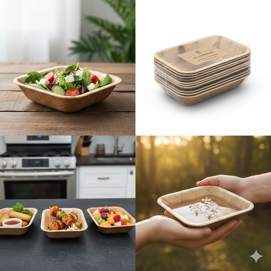 Certified Sustainable & Chemical-Free While many eco-products still use hidden liners or binders, this plate is crafted 100% from the naturally fallen sheath of the Areca Catechu palm, washed only with water. It offers a premium, wood-grain aesthetic that appeals to eco-conscious consumers. Fully backyard compostable and free from wax or plastic coatings, it allows businesses to scale their operations sustainably without contributing to landfill waste.