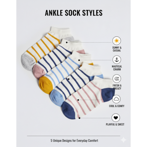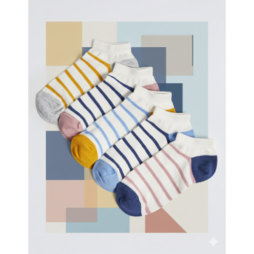 This pack of five compact cotton striped ankle socks is designed to offer improved softness, durability, and comfort for daily use. Crafted from Compact Cotton 70%, Nylon 28%, and Elastane 2%, the socks provide a smoother texture, reduced pilling, and enhanced stretch retention even after repeated washes. Each pack contains assorted stripe patterns that suit school uniforms, casual wear, and everyday activities.