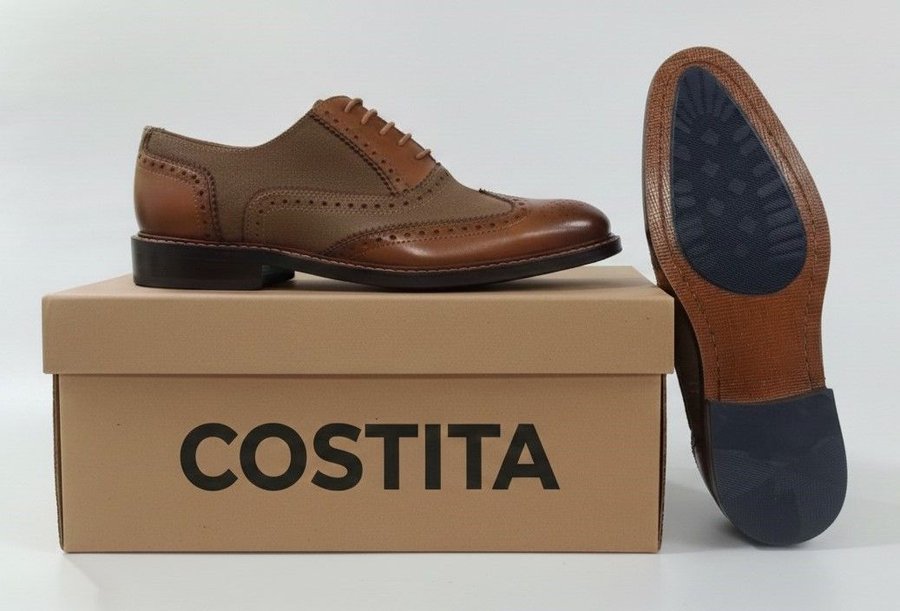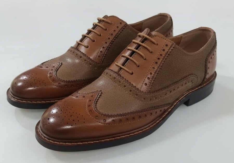 Kingsley Brogue Shoe – Export-Grade Dress-Casual Footwear This brogue shoe bridges formal and casual market segments through dual-material construction and decorative perforation detailing. The combination of cow swiss cognac smooth leather with cow suede cognac panels creates visual texture contrast while maintaining tonal color continuity, supporting versatile wear across business casual and social occasion contexts. Brogue perforation patterns provide aesthetic differentiation and improve upper breathability, reducing interior moisture accumulation during extended wear periods of 6-8 hours. The swiss leather component delivers a semi-gloss surface finish with enhanced color saturation compared to standard chrome-tanned leather, maintaining appearance consistency across production batches for private label programs requiring color matching. Suede panels at lateral quarter sections absorb minor impact marks and resist visible creasing, extending the visual life of the upper by 25-35% compared to all-smooth leather constructions. Sheep leather lining provides interior comfort and moisture transfer, with unit weight of 850 grams balancing material density against wearing comfort for all-day use. Packed 12 pairs per master carton at 34x21x13 cm with total carton weight of 10.2 kg, the format supports manual handling requirements across international logistics chains. Size run from UK 6 to 10 covers primary distribution needs for Western export markets. The dual-material construction supports premium positioning within dress-casual categories while maintaining production efficiency through standardized component sourcing. Manufactured at BIS-certified facility under UDYAM registration with quality control systems covering material inspection and finished goods verification. HSN code 6403 51 11 classification applies to multi-material leather footwear with decorative elements, carrying 18% GST rate for export documentation. Factory compliance includes chemical testing protocols for leather processing and material disclosure documentation supporting EU REACH requirements for international distribution partners.